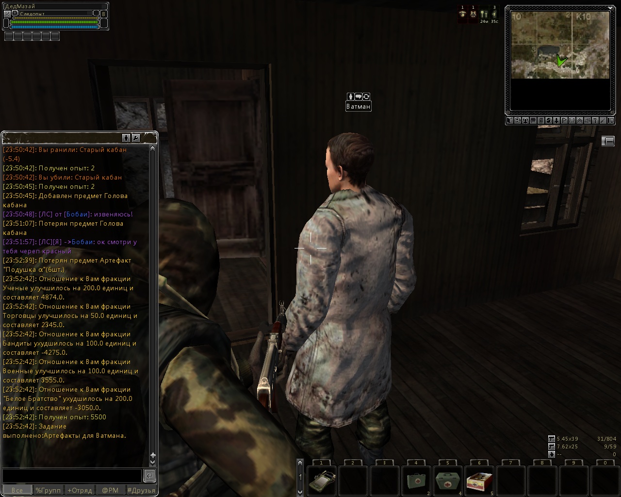 7) Скупщик (Где найти НПС: на Станции) (предыдущий квест: Серый) >>Принести Волос БД. В доме Харона или за домом убить Домового, из трупа взять Волос БД. награда - репутация: свободный бартер +100, торговцы -100, бандиты +25, военные -25; деньги: 80р.; опыт: +300 Обменяет Волос БД на патроны 9х18 ПМ 27 шт.