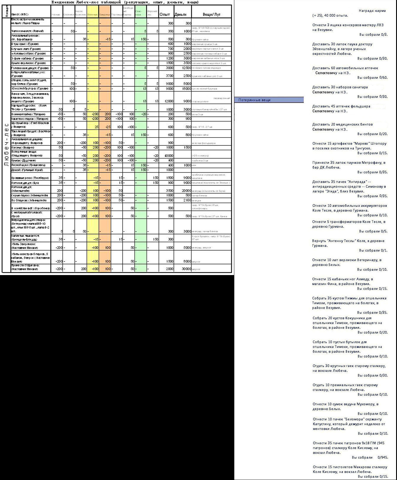Предлагаю вариант информации по ежедневкам в виде Excel таблички (на трёх листах) (актуально для вер. 0.9.2.1.5). Если есть какие-то замечания, то присылайте. Только данные нужно присылать после второго их прохождения (можно мне в ЛС), т.к. первоначальная награда за эти квесты может отличатся от награды в последующем (как ЕЖЕДНЕВКИ). Часть ежедневок стали цикличными, т.е. их надо выполнять в течении 6 дней каждые 24 часа (превышение не более 2-х часов) с увеличением опыта за каждый день. Таблица перенесена в шапку темы. Хочу обратить внимание что теперь нивилирующих (т.е. выравнивающих) ежедневок для какой-то группировки НЕТ. Все ежедневки если плюсуют репу к одним, но тут-же минусуют к другим. В общем сами смотрите...Таблички эти выложил также в виде картинок в формате ..JPG. После обновления в патче 0.9.1.4 часть несюжетных квестов стали ежедневками, так что по мере их выполнения таблицы будут дополняться. По ежедневке кладовщика у Имарека "Потерянные вещи" в локе Любеч-лес добавил скрин что и кому необходимо собрать.