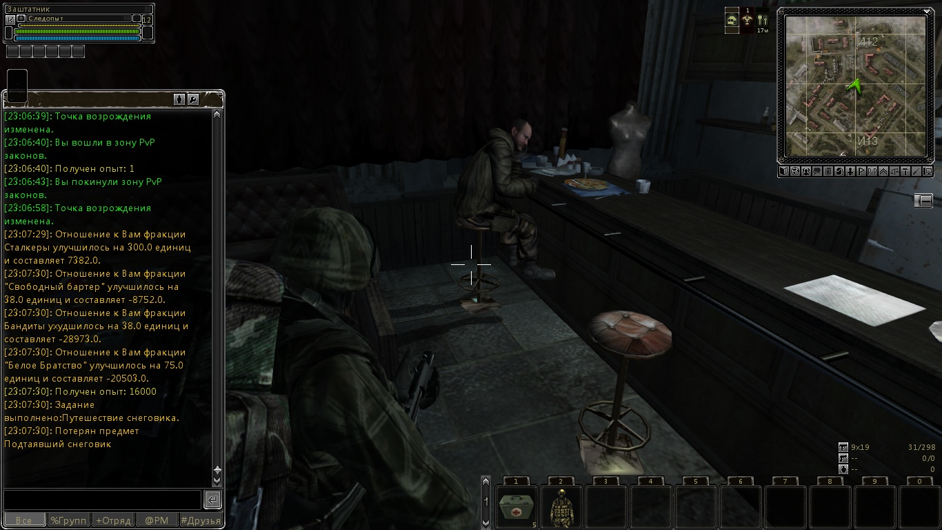 6) Серый (Где найти НПС: возле Доктора) (предыдущий квест: Дежурный) >>Найти друга Серого - Толяна и его рюкзак и убить 5 крыс-убийц возле него. Идём от поезда в самый низ к воде, там тело Толяна лежит - обыскиваем труп (ничего нет). Идём к воде через проход в ограде. Там рюкзак лежит в воде на островке - обыскиваем рюкзак награда - вещь: патроны 9х18 ПМ (отсыревшие) 81 шт. Возвращаемся к Серому с докладом. награда - репутация: сталкеры +150, свободный бартер +15, бандиты -15, белое братство +38; опыт: +300; вещь: патроны 9х18 ПМ 27 шт. P.S. При обыске рюкзака Толяна ПМ про который говорит Серый так и не находим! >>Серый говорит что на северо-востоке есть Домовые их Волос БД можно продать Скупщику! >>(см. Скупщик) >>Опасные соседи. Убить 10 крыс (ПОЛУДНЕВКА) награда - репутация: сталкеры +150, свободный бартер +15, бандиты -15, белое братство +38; опыт: +500