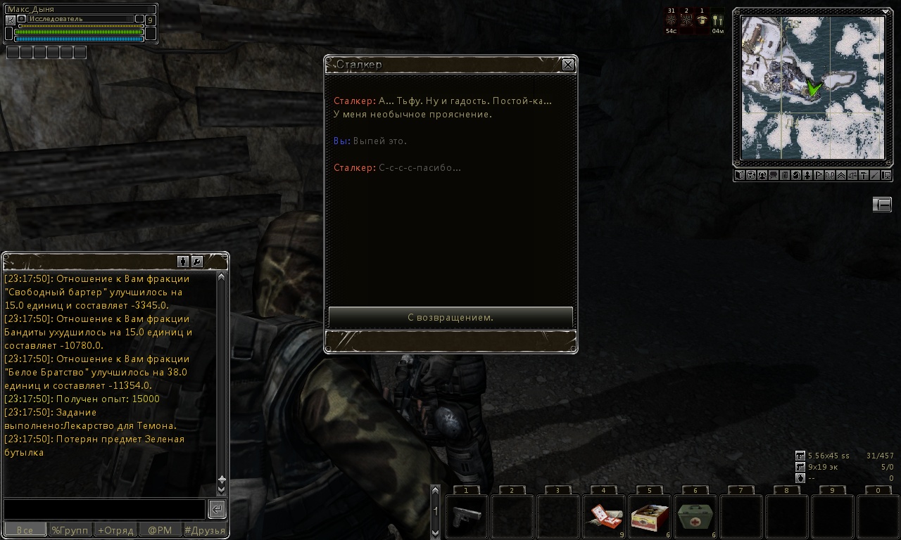 5) Доктор (Где найти НПС: на Станции) Говорим с ним о ранениях и их лечении награда - опыт: +10; вещь: аптечка автомобильная Перетаскиваем аптечку в первый слот! Доктор продаёт: аптечка автомобильная - 225 р., антирад - 6750 р., бинты - 450 р. Может подлечить: обычное лечение - 50 р., лечение радиации - 300 р.