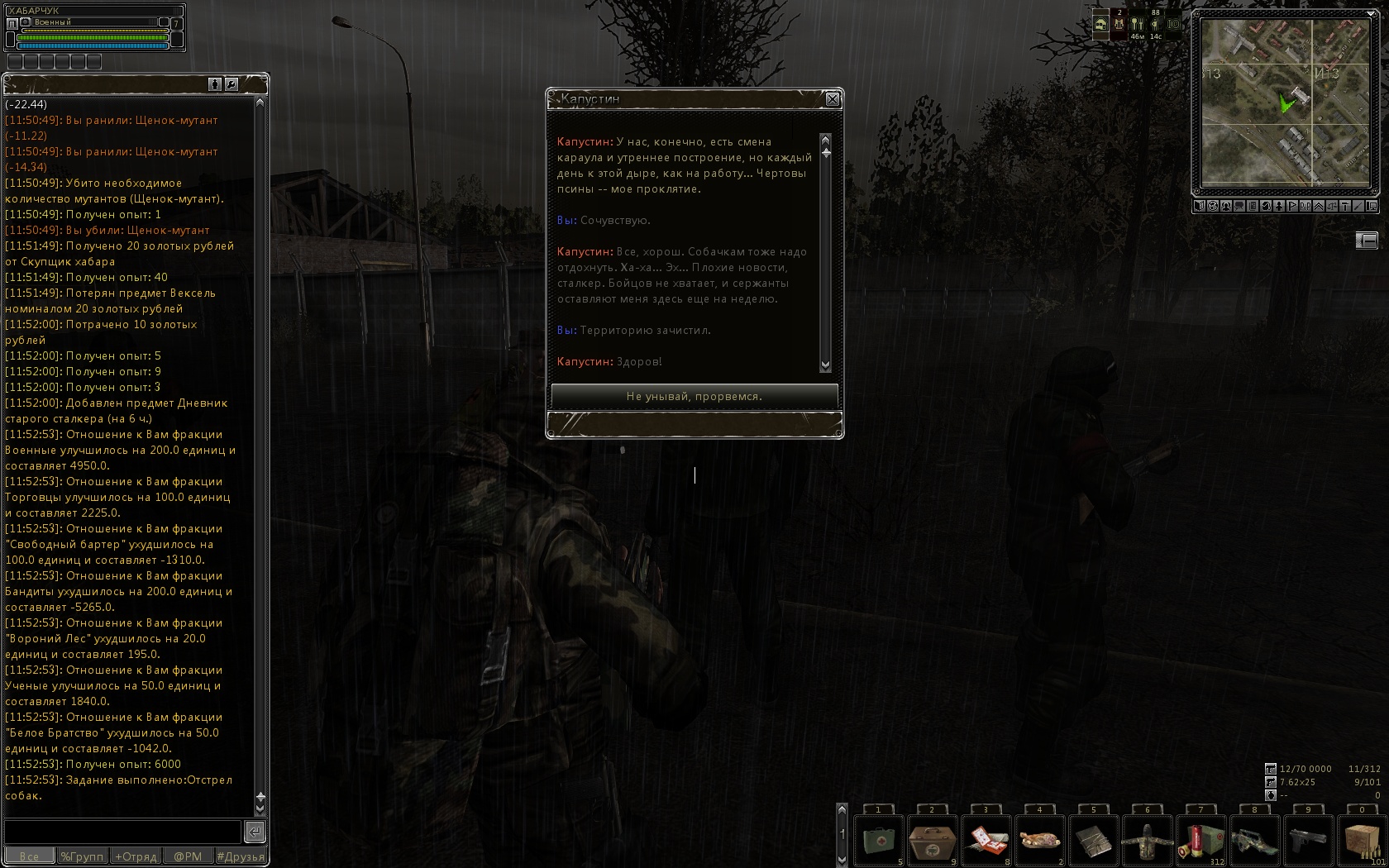 6) Серый (Где найти НПС: возле Доктора) (предыдущий квест: Дежурный) >>Найти друга Серого - Толяна и его рюкзак и убить 5 крыс-убийц возле него. Идём от поезда в самый низ к воде, там тело Толяна лежит - обыскиваем труп (ничего нет). Идём к воде через проход в ограде. Там рюкзак лежит в воде на островке - обыскиваем рюкзак награда - вещь: патроны 9х18 ПМ (отсыревшие) 81 шт. Возвращаемся к Серому с докладом. награда - репутация: сталкеры +150, свободный бартер +15, бандиты -15, белое братство +38; опыт: +300; вещь: патроны 9х18 ПМ 27 шт. P.S. При обыске рюкзака Толяна ПМ про который говорит Серый так и не находим! >>Серый говорит что на северо-востоке есть Домовые их Волос БД можно продать Скупщику! >>(см. Скупщик) >>Опасные соседи. Убить 10 крыс (ПОЛУДНЕВКА) награда - репутация: сталкеры +150, свободный бартер +15, бандиты -15, белое братство +38; опыт: +500