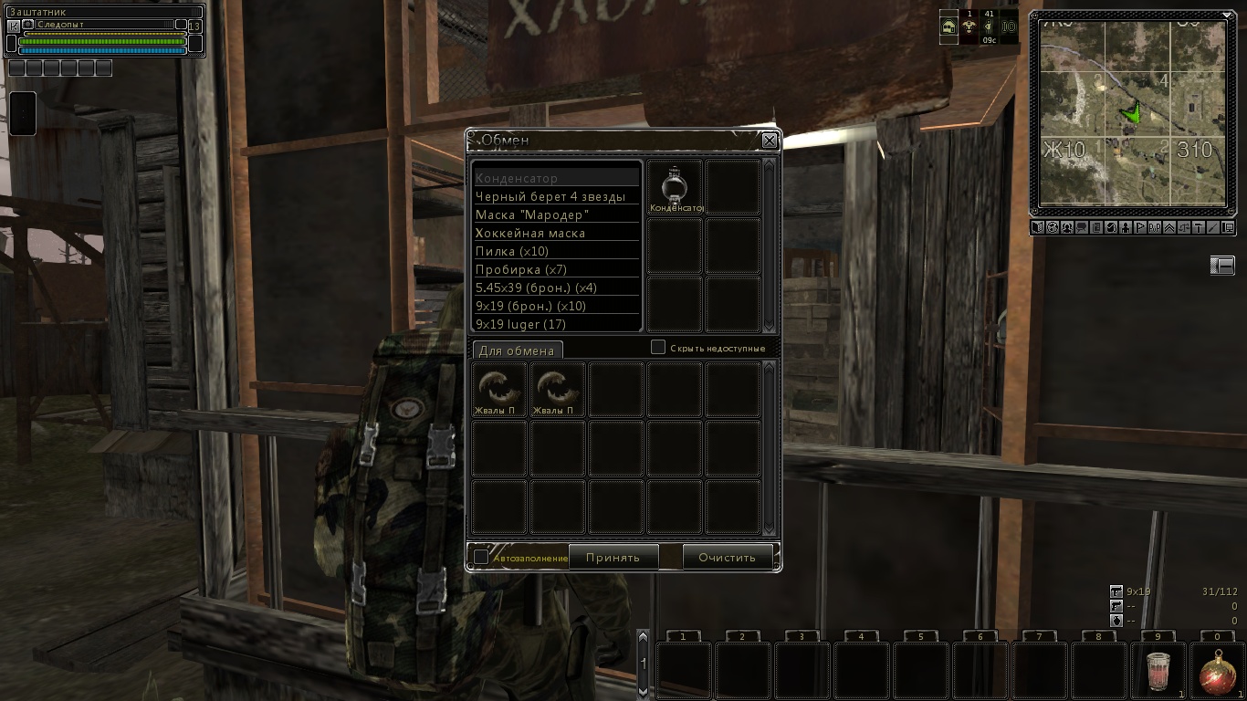 Продавец патронов продаёт: патроны 9х18 ПМ (отсыревшие) 27 шт. за 54р. Продавец брони продаёт: Шапка Вязанка - 9880 р., Куртка Штормовка - 8600 р., Рваная Куртка Хаки - 400 р., Рваные Штаны Хаки - 400 р., Кепка - 500 р.