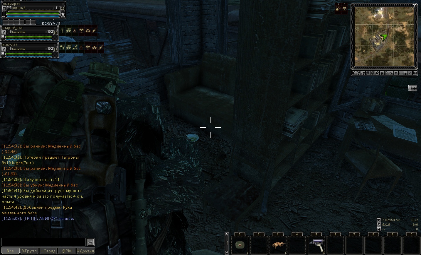 6) Серый (Где найти НПС: возле Доктора) (предыдущий квест: Дежурный) >>Найти друга Серого - Толяна и его рюкзак и убить 5 крыс-убийц возле него. Идём от поезда в самый низ к воде, там тело Толяна лежит - обыскиваем труп (ничего нет). Идём к воде через проход в ограде. Там рюкзак лежит в воде на островке - обыскиваем рюкзак награда - вещь: патроны 9х18 ПМ (отсыревшие) 81 шт. Возвращаемся к Серому с докладом. награда - репутация: сталкеры +150, свободный бартер +15, бандиты -15, белое братство +38; опыт: +300; вещь: патроны 9х18 ПМ 27 шт. P.S. При обыске рюкзака Толяна ПМ про который говорит Серый так и не находим! >>Серый говорит что на северо-востоке есть Домовые их Волос БД можно продать Скупщику! >>(см. Скупщик) >>Опасные соседи. Убить 10 крыс (ПОЛУДНЕВКА) награда - репутация: сталкеры +150, свободный бартер +15, бандиты -15, белое братство +38; опыт: +500