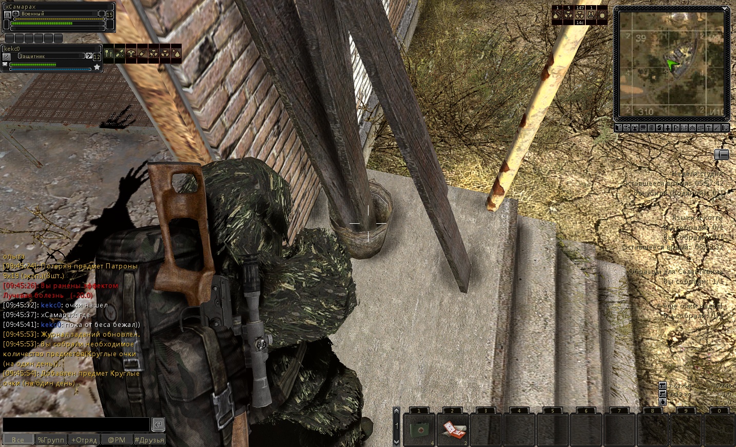 6) Серый (Где найти НПС: возле Доктора) (предыдущий квест: Дежурный) >>Найти друга Серого - Толяна и его рюкзак и убить 5 крыс-убийц возле него. Идём от поезда в самый низ к воде, там тело Толяна лежит - обыскиваем труп (ничего нет). Идём к воде через проход в ограде. Там рюкзак лежит в воде на островке - обыскиваем рюкзак награда - вещь: патроны 9х18 ПМ (отсыревшие) 81 шт. Возвращаемся к Серому с докладом. награда - репутация: сталкеры +150, свободный бартер +15, бандиты -15, белое братство +38; опыт: +300; вещь: патроны 9х18 ПМ 27 шт. P.S. При обыске рюкзака Толяна ПМ про который говорит Серый так и не находим! >>Серый говорит что на северо-востоке есть Домовые их Волос БД можно продать Скупщику! >>(см. Скупщик) >>Опасные соседи. Убить 10 крыс (ПОЛУДНЕВКА) награда - репутация: сталкеры +150, свободный бартер +15, бандиты -15, белое братство +38; опыт: +500